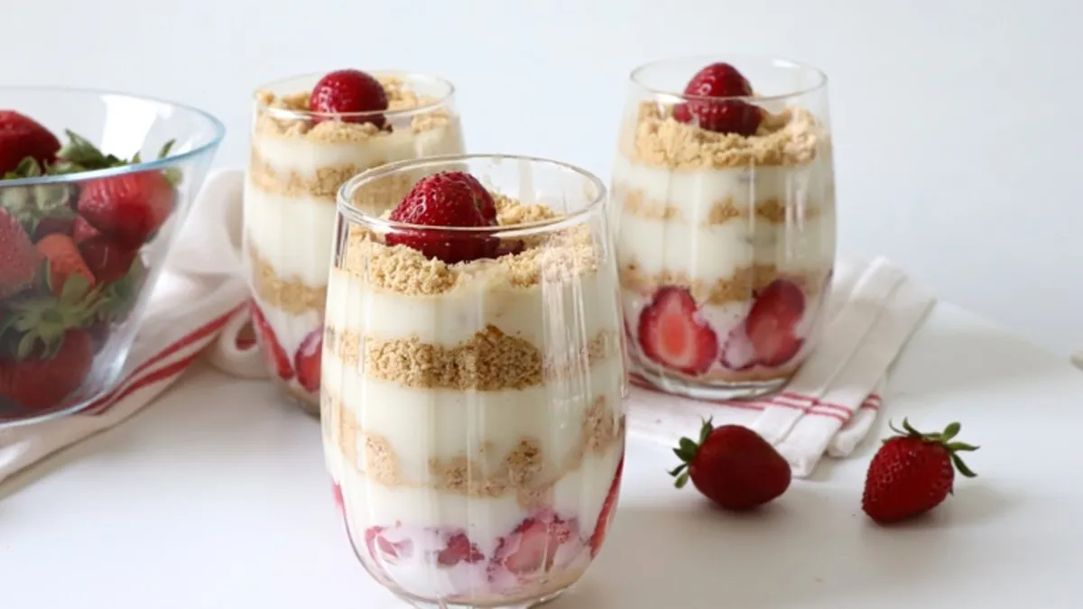 Üzerini çilek ve bisküvi kırıntılarıyla süsleyerek servis yapın. Afiyet olsun!