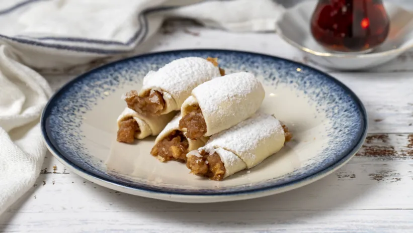 Hamur parçalarının her birine 1 tatlı kaşığı soğutmuş olduğunuz elmalı harçtan ekleyin.