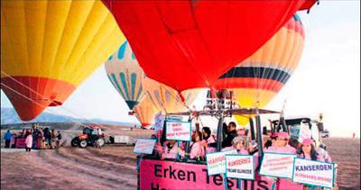 Kanseri Bilinçlendirme Ayı etkinlikleri kapsamında Nevşehir'in turistik bölgesi Kapadokya'da düzenlenen etkinlikte sıcak hava balonları "Hastalarla El Ele, Kanser Sana Güle Güle" sloganıyla havalandı.