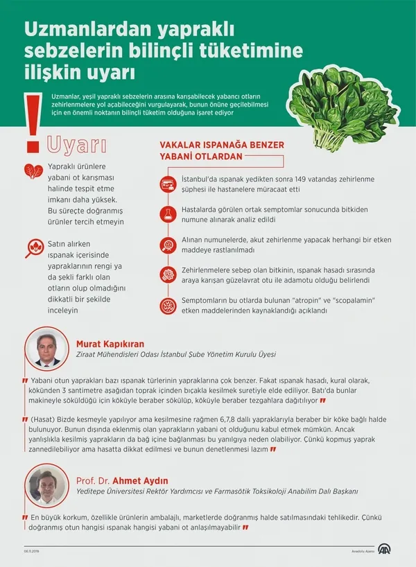 Farmasötik Toksikoloji Anabilim Dalı Başkanı Prof. Dr. Ahmet Aydın da vatandaşlara bu süreçte özellikle marketlerde satılan doğranmış ürünleri almaması yönünde tavsiyede bulunarak, "En büyük korkum, özellikle ürünlerin ambalajlı, marketlerde doğranmış halde satılmasındaki tehlikedir. Çünkü doğranmış otun hangisi ıspanak hangisi yabani ot anlaşılmayabilir. O nedenle vatandaşımızın şu anda bir süre doğranmış ürünü tercih etmemesi ve bütün ıspanak tüketmesi gerektiğini düşünüyorum." diye konuştu.