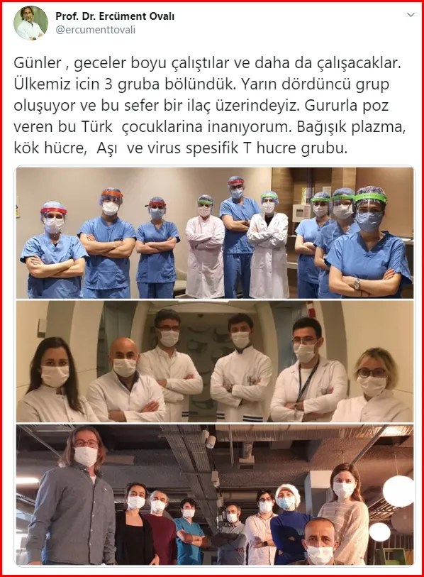 Korona virüs aşısı geliştirmek için ekibiyle birlikte laboratuvarda kendini karantinaya alan Prof. Dr. Ercüment Ovalı, Twitter hesabından daha önce yaptığı açıklamada, "7 gün 16 saat laboratuvarda çalıştıktan sonra artık kurduğumuz sistemin güvenli olduğu kanıtlandı. Şimdi kahramanlarım içeri giriyor. Kaldığım yerden onlar devam edecek. İlk ekip @YurtseverBulut, Gözde, Recai, sonra sayıları kademeli olarak artacak. 23 Nisan için sözleştik" ifadelerini kullanmıştı.