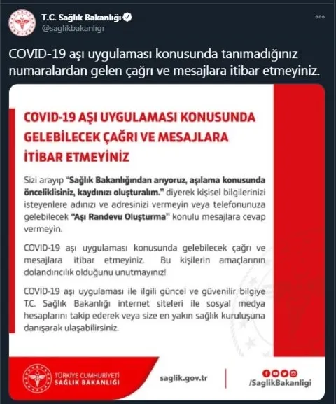"Sizi arayıp 'Sağlık Bakanlığından arıyoruz, aşılama konusunda önceliklisiniz, kaydınızı oluşturalım' diyerek kişisel bilgilerinizi isteyenlere adınızı ve adresinizi vermeyin veya telefonunuza gelebilecek 'Aşı Randevu Oluşturma' konulu mesajlara cevap vermeyin. Covid-19 aşı uygulaması konusunda gelebilecek çağrı ve mesajlara itibar etmeyiniz. Bu kişilerin amaçlarının dolandırıcılık olduğunu unutmayınız! Covid-19 aşı uygulaması ile ilgili güncel ve güvenilir bilgiye T.C. Sağlık Bakanlığı internet siteleri ile sosyal medya hesaplarını takip ederek veya size en yakın sağlık kuruluşuna danışarak ulaşabilirsiniz" denildi.