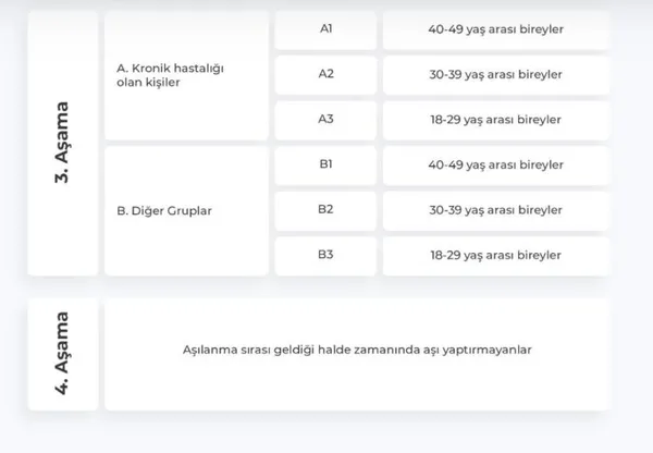 4- DİĞER VATANDAŞLAR: Daha sonraki planlamada 50 ile 64 yaş arası kronik hastalığı olanlar ve 50-64 yaş arası diğer kişiler bulunacak ve giderek 50 yaş altı kronik hastalığı olanlar, 18-49 yaş arası genç yetişkinler aşılanacak. Topluma aşı uygulaması ağırlıklı olarak aile sağlığı merkezlerinde yapılacak.