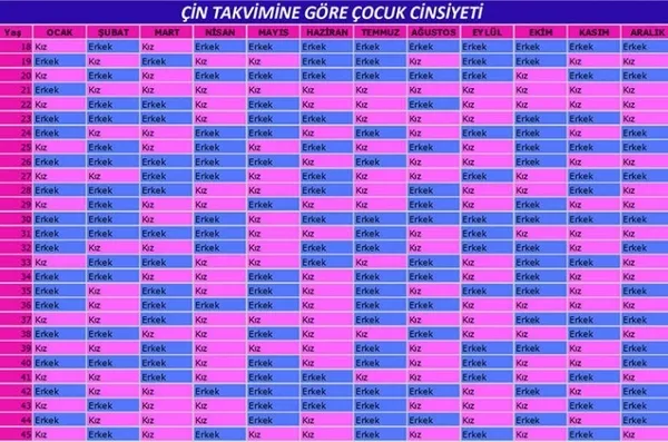 Çin takvimi 2021 birçok anne adayı tarafından araştırılmaya devam ediyor. Son zamanlarda ülkemizde ve Avrupa'da popülerliğini koruyan ve hamile kadınların çocuklarının cinsiyetlerini tahmin etmek için kullandığı bu takvimin bilimsel herhangi bir dayanağı bulunmamaktadır. Ancak bazı iddialara göre yüzde 70 oranlar doğruluk payı olduğu bilinmektedir. Hesaplama yapılırken anne adayının yaşı ve hamile kaldığı ay baz alınır. Peki, Çin takvimi ile cinsiyet hesaplama doğru mu? çin takvimi bebek cinsiyeti nasıl hesaplanır? İşte detaylar…
