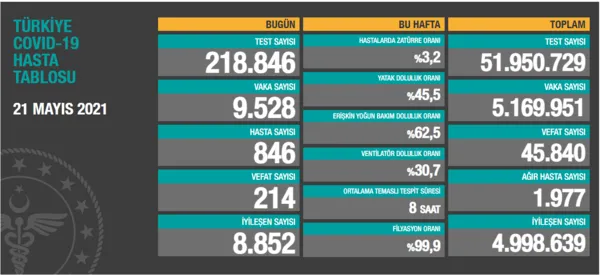 Türkiye'de son 24 saatte 218 bin 846 koronavirüs testi yapıldı. Vaka sayısı yine 10 binin altında kaldı ve 9 bin 528 oldu. Hasta sayısı 846 olurken, ağır hasta aylar sonra iki binin altına geriledi ve bin 977 olarak kayıtlara geçti.