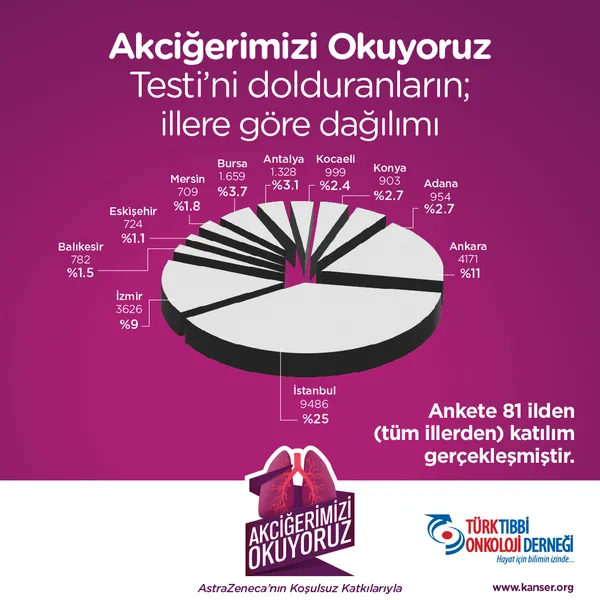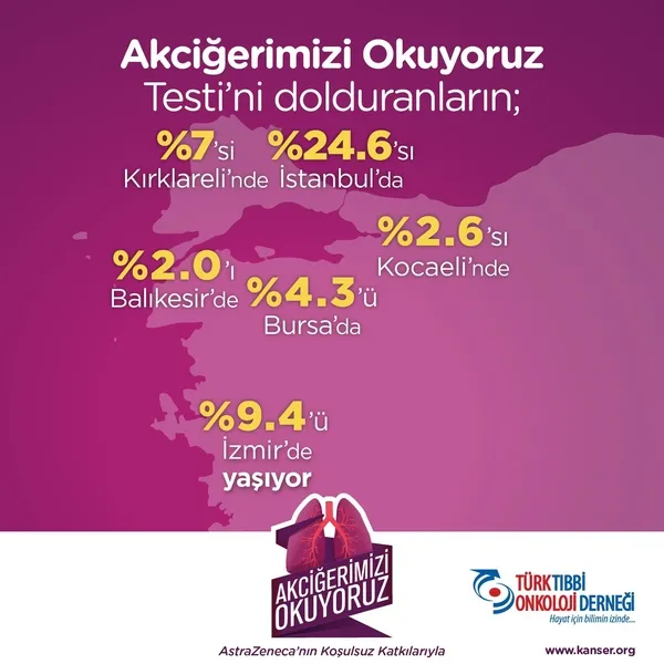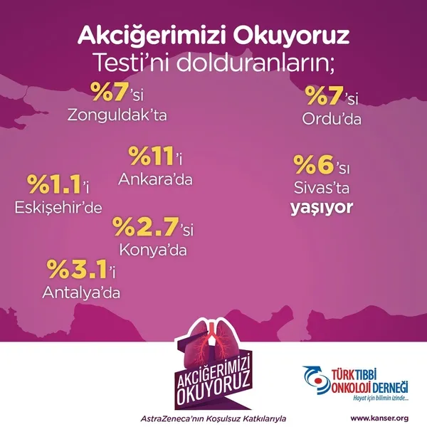 "Akciğerimizi Okuyoruz" platformu üzerinden bugüne kadar yaklaşık 40 bin kişiden elde edilen ve akciğer kanserinde erken teşhis konusunda toplumda farkındalık yaratacak veriler; Türk Tıbbi Onkoloji Derneği tarafından düzenlenen toplantıda kamuoyu ile paylaşıldı. Türk Tıbbi Onkoloji Derneği Başkanı Prof. Dr. Murat Dinçer, "Akciğer kanserinin küçükken ve yayılmadan önce, erken bir evrede tespit edilmesi, başarılı bir şekilde tedavi edilme olasılığını artırır" derken, Türk Tıbbi Onkoloji Derneği Genel Sekreteri Prof. Dr. Özlem Sönmez ise "Sigara, akciğer kanserinin tartışmasız en önemli sebebidir ve akciğer kanserlerinin yüzde 90'ından sorumludur" dedi. Projeye destek veren AstraZeneca Türkiye'nin Ülke Başkanı Ecz. Serkan Barış da Dünya Sağlık Örgütü verilerine göre Türkiye'de kanser ölümlerinin yüzde 18'inin akciğer kanseri nedeniyle gerçekleştiğinin altını çizdi. Halk Sağlığı Anabilim Dalı Öğretim Üyesi Prof. Dr. Gül Ergör de Türkiye'de her yıl 41 bin kişiye yeni akciğer kanseri tanısı konulduğuna dikkat çekerek, "Bu kişilerin 34 binini erkek 7 binini ise kadınlar oluşturuyor. Türkiye Kanser İstatistikleri 2018 yılı sonuçlarına göre ise akciğer kanseri tanısı alanların yüzde 19'u bölgesel, yüzde 28'i yakın dokulara yayılım (metastaz) ve yüzde 53'ü ise uzak dokulara yayılım (metastaz) yapmış durumdadır. Konulan tanıların maalesef yarısından çoğunun geç tanı olması oldukça üzücü. 2040 yılına kadar yılda 75 bin kişinin akciğer kanseri hastası olacağı tahmin ediliyor" dedi.