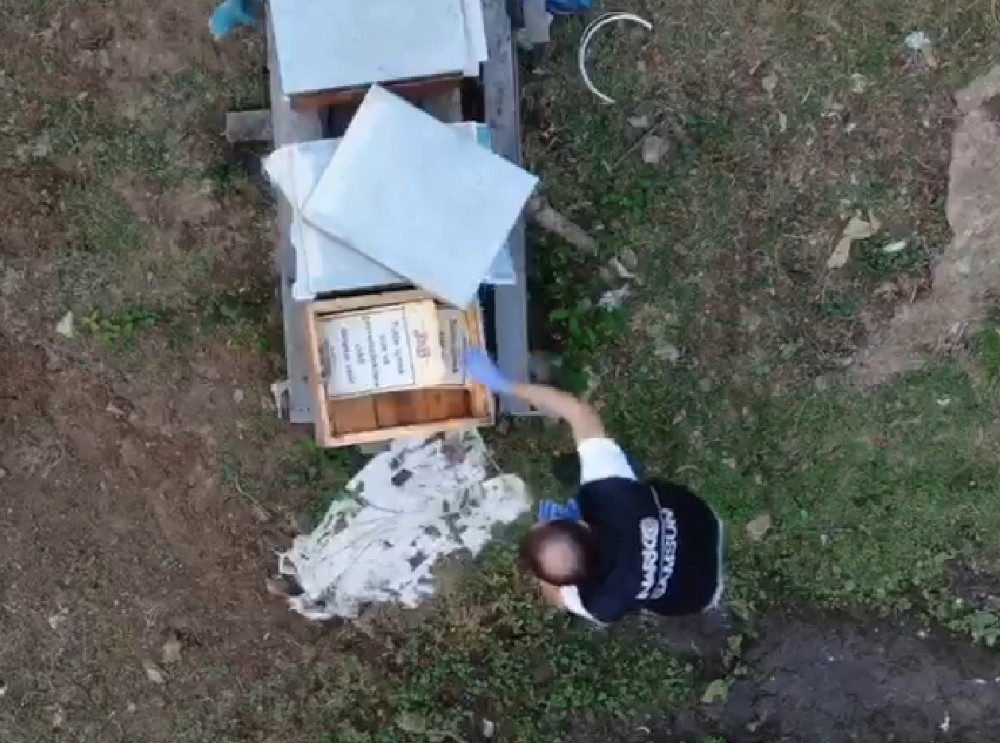 Polis droneu ile operasyon anbean görüntülenirken, operasyonda narkotik dedektör köpeği de görev altı. Polisin arılar sokmasın diye arı kovanı içinde arama yaparken özel kıyafet giymesi dikkat çekti. Olayla ilgili A.Y. gözaltına alındı. Soruşturma devam ediyor.