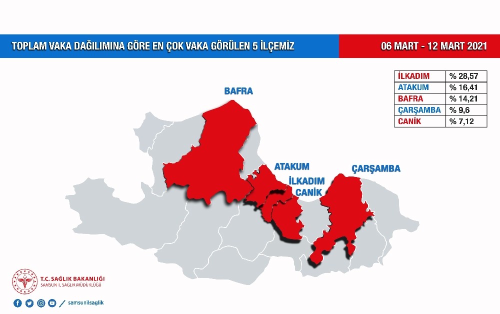 Samsun İl Sağlık Müdürlüğü’nden yapılan açıklamada, “İlimize ait Kovid-19 verilerinin, halkımızın bilgilendirilmesi adına paylaşılması uygulamasına bu hafta itibariyle başlıyoruz. Sağlık Bakanlığımız veri setleri ve tarih aralıklarına (6- 12 Mart) göre yapılacak paylaşımlarda, bu hafta itibariyle ‘100 binde vaka sayısına göre en çok vaka görülen 5 ilçemiz’ ve ‘toplam vaka dağılımına göre en çok vaka görülen 5 ilçemiz’ tabloları hazırlanarak sunulmuştur. Her hafta cuma günü sosyal medya adreslerimiz üzerinden yayınlanması planlanan tablolarımızın sayısı ve içeriği yine bakanlık veri setlerimize göre güncellenecektir” denildi.