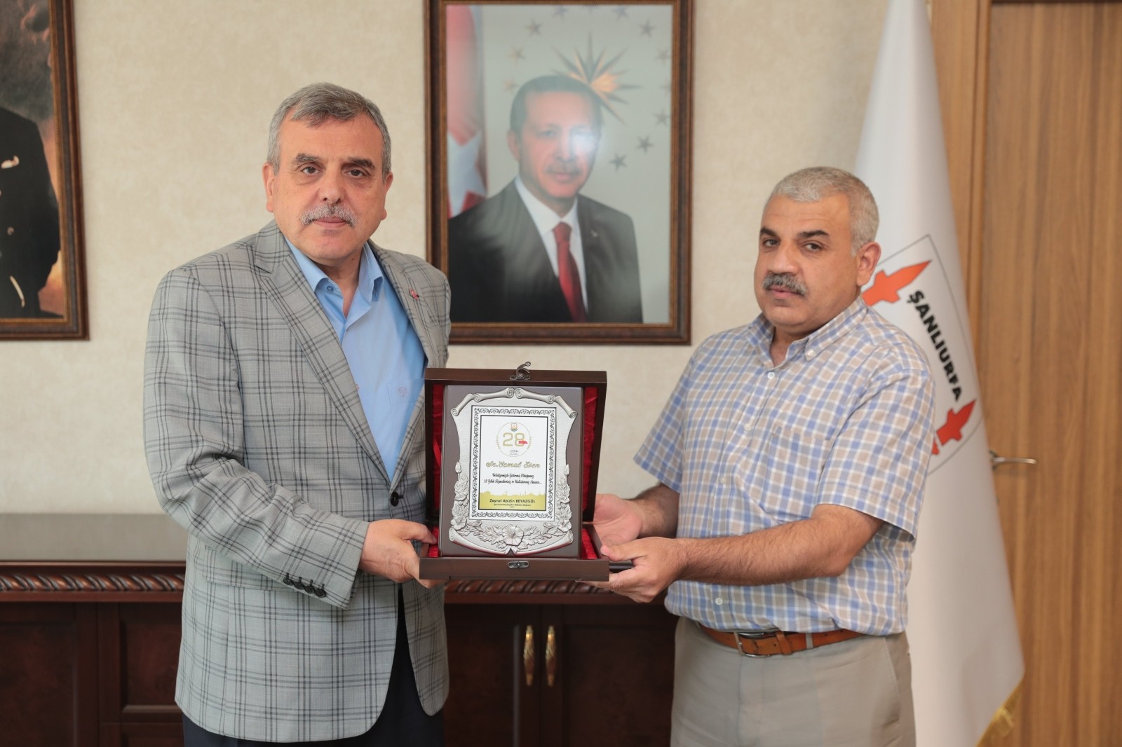 Şanlıurfa Büyükşehir Belediyesi Başkanı Zeynel Abidin Beyazgül, emekliye ayrılan başkan sekreteri Cemal Esen’e 28 yıllık emeği nedeniyle teşekkür plaketi takdim etti.