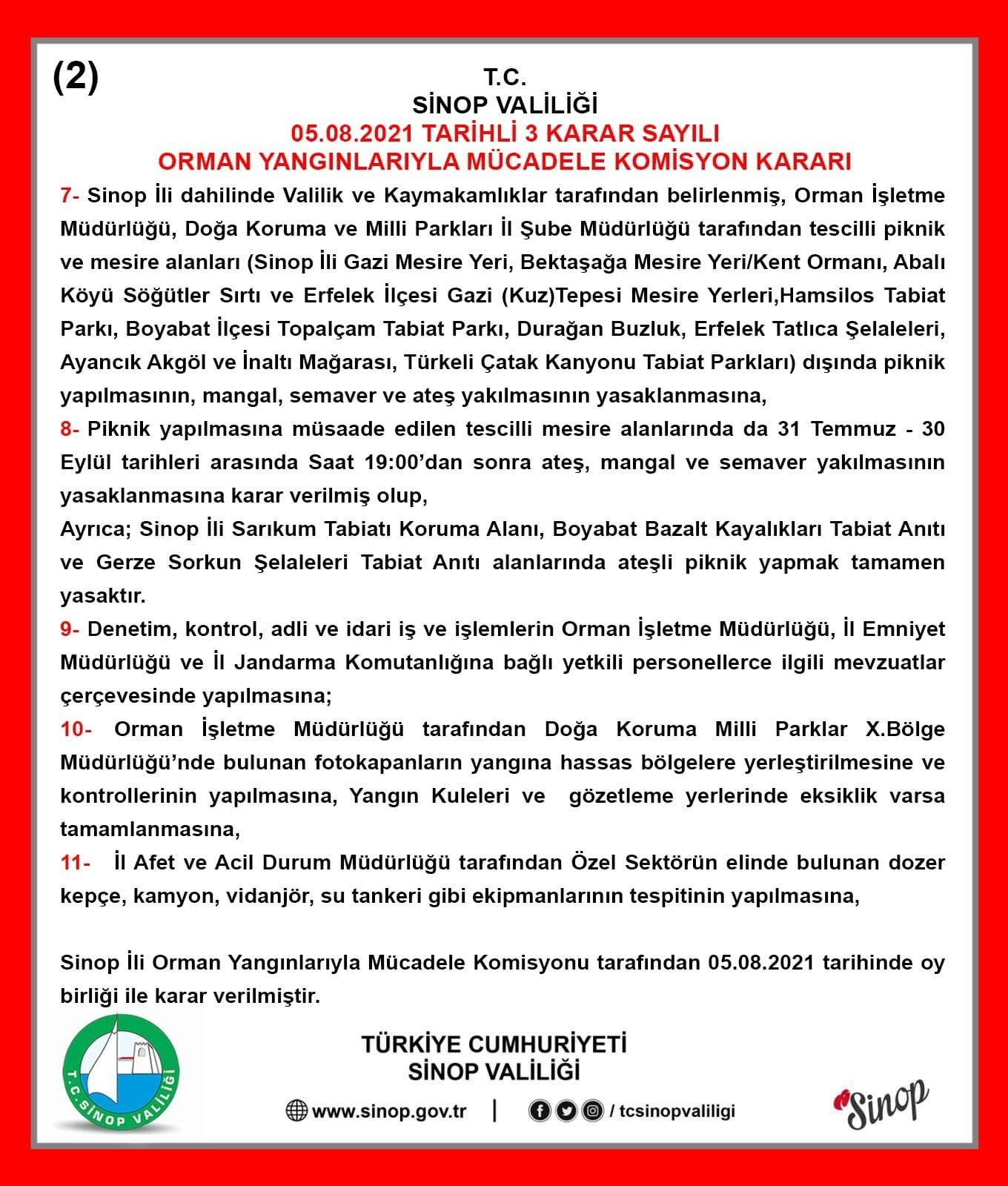 Ayrıca Sarıkum Tabiatı Koruma Alanı, Boyabat Bazalt Kayalıkları Tabiat Anıtı ve Gerze Sorkun Şelaleleri Tabiat Anıtı alanlarında ateşli piknik yapmanın tamamen yasaklandığı duyuruldu.