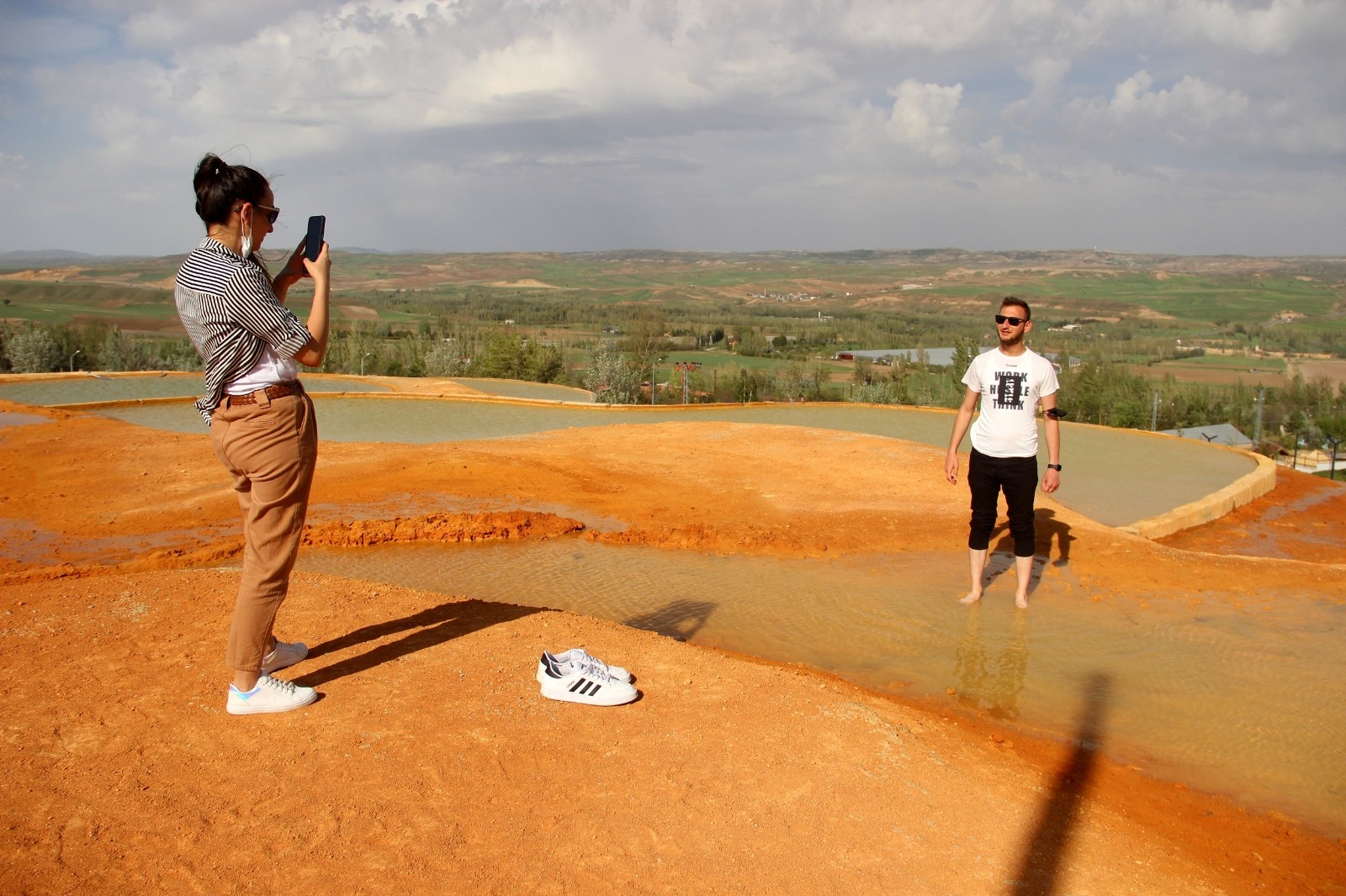 Sivas’ın Sıcak Çermik bölgesinde altın sarısı rengiyle Pamukkale travertenlerini andıran Altınkale ziyaretçilerini ağırladı.Sivas kent merkezine 31 kilometre uzaklıkta bulunan Altınkale, havaların ısınmasıyla birlikte ziyaretçilerini ağırlamaya devam ediyor. Pamukkale travertenlerini andıran Altınkale, doğal suyu ve altın sarısı rengiyle görenlerin dikkatini çekiyor. Buraya gelen vatandaşlar fotoğraf çekinmeyi de ihmal etmiyor. Bazı vatandaşlar ise ayakkabılarını çıkartıp su içerisinde yürüyüş yapıyor. Öte yandan çocuklar da havuzların içerisine girerek doyasıya eğleniyor.“Çok beğendik”Ailesiyle beraber Altınkale’yi gezmeye gelen Ayşegül Teke, “Sivas’ın güzelliklerini...