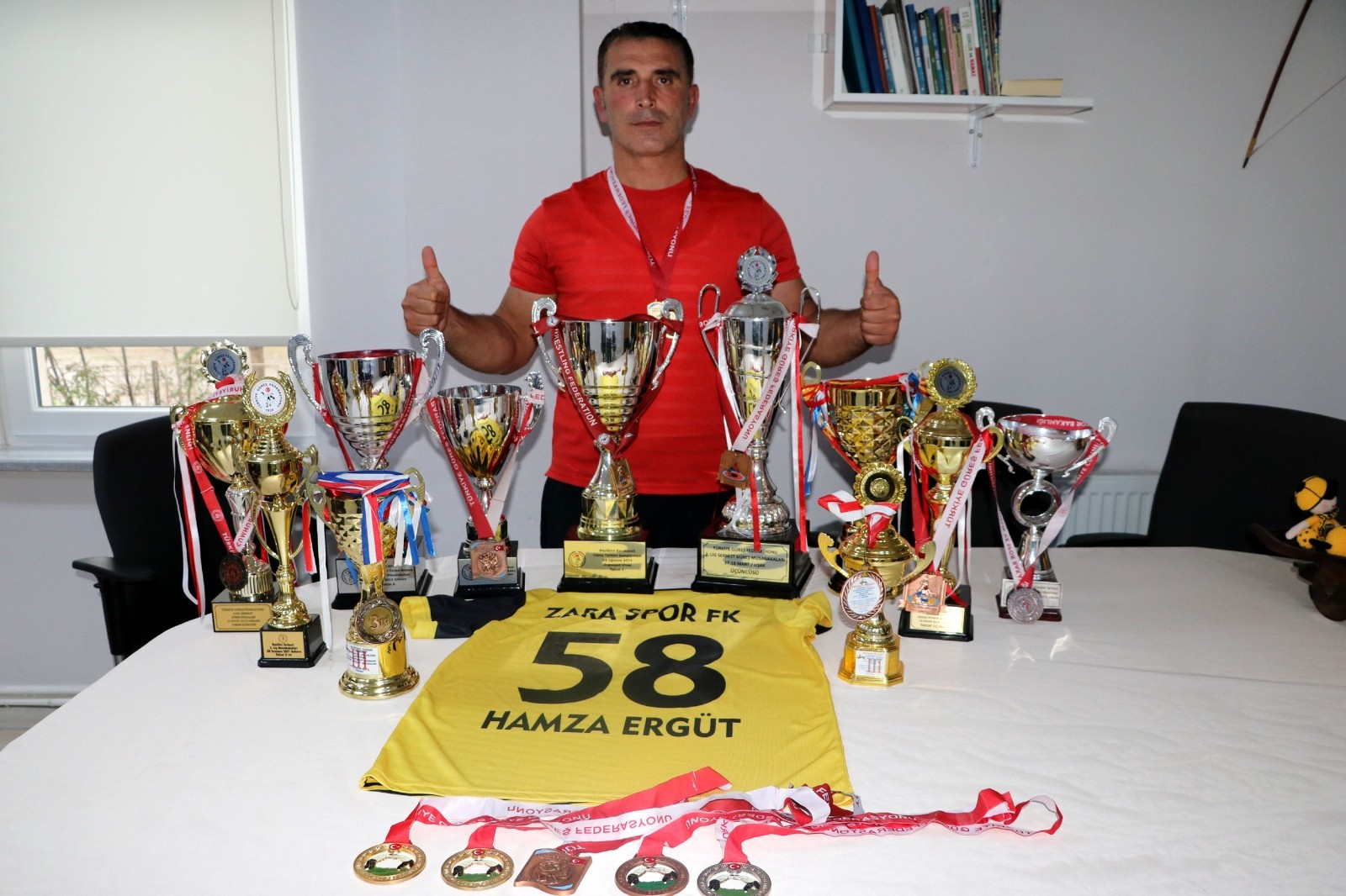Sivas’ın Zara ilçesinde 3 kurumun müdürlüğünü, 2 kulübün başkanlığı ile antrenörlük görevlerini yürüten Hamza Ergüt’ün ulusal ve uluslararası müsabakalarda da birçok başarısı bulunuyor. Sivas’ın Zara ilçesinde yaşayan 42 yaşındaki Hamza Ergüt çocukluk yıllarından bu yana sporla ilgileniyor. Yaşamına birçok başarı sığdıran Ergüt, ilçede 3 kurumun müdürlüğünü, 2 kulübün başkanlığını ve antrenörlük görevlerini yürütüyor. Zara Gençlik ve Spor İlçe Müdürlüğü, Zara Kredi Yurtlar Kurumu Müdür Vekilliği, Gençlik Merkezi Müdür Vekilliği görevlerini üstelenen Hamza Ergüt, ulusal ve uluslararası müsabakalarda birçok başarı elde etti. On parmağında on marifet olan Ergüt, yeni sporcuların yetişmesi için büyük çaba sarf ediyor. İşini severek yaptığını söyleyen Ergüt, görevlerini sürdürürken yorulsa bile verdikleri emeğin karşılığında başarı elde edildiğinde mutlu olduklarını ifade etti.