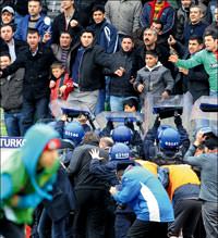Otelde de kuş uçurtulmuyordu. Giriş-çıkışlar kontrol ediliyor, gece düğüne gelenler bile davetiye ve kimlik ibrazıyla giriyorlardı. Otelin dışında da güvenlik barikatı vardı. Ertesi sabah şehirde fırtına öncesi sessizlik hakimdi. Yollarda polis ve taraftarlar arasında kovalamaca sürüyordu. Stat 13.30'da tamamen dolmuştu. Dışarıda kalan kalabalık da en az içerideki kadardı. Tezahüratlar maçın gergin geçeceğinin habercisiydi.