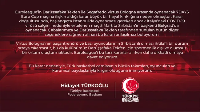 TBF Başkanı Hidayet Türkoğlu, federasyonun internet sitesi üzerinden yaptığı açıklamada şu ifadelere yer verdi: "Euroleague'in Darüşşafaka Tekfen ile Segafredo Virtus Bologna arasında oynanacak 7DAYS Euro Cup maçına ilişkin aldığı karar büyük bir hayal kırıklığına neden olmuştur. Karar doğrultusunda, başlangıçta İstanbul'da oynanması gereken ancak İtalya'daki COVID-19 virüsü salgını nedeniyle ertelenen maç 5 Mart'ta Sırbistan'ın başkenti Belgrad'da oynanacak. Çabalarımıza ve Darüşşafaka Tekfen tarafından sunulan bütün diğer seçeneklere rağmen alınan bu kararı anlaşılmaz buluyorum. Virtus Bologna'nın başantrenörü ve bazı oyuncularının Sırbistanlı olması ihtilaflı bir durum ortaya çıkarmıştır, bu da kulübümüz Darüşşafaka Tekfen için sportmenlik dışı ve olumsuz bir ortam oluşturmaktadır. Euroleague'i bu tarz kararlar alırken daha dikkatli olmaya davet ediyorum. Bu karar nedeniyle, Türk basketbol camiasının bütün takımları, oyuncuları ve kurumsal paydaşlarıyla kırgın olduğuna inanıyorum."