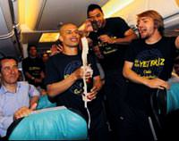 Fenerbahçe'nin önceki gece Sivas'ta şampiyonluğunu ilan etmesinin ardından stat ve soyunma odasındaki coşkunun bir sonraki adresi takımı İstanbul'a getiren özel uçaktı. Başkan Aziz Yıldırım, yöneticiler, futbolcular ve eşlerini taşıyan uçakta kalkıştan kısa bir süre sonra tezahüratlar başladı. Futbolcuların kutlamalarına zaman zaman Aykut Kocaman da dahil oldu. Uçak İstanbul'a inene kadar Fenerbahçe marşları ve tezahüratları hiç dinmezken, kutlamayı art arda patlatılan şampanyalar süsledi.