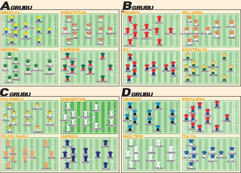 Dünya Kupası'nda mücadele edecek 32 takım da turnuvaya taktiksel olarak hazırlanırken, teknik adamların en çok tercih ettiği diziliş olarak 4-2-3-1 öne çıkıyor. Hem kanatları hem de merkez orta sahayı savunmaya öncelik verenlerin kullandığı 4-2-3-1 dizilişi Dünya Kupası'na damga vuracağa benziyor. Meksika'nın ofansif 5-3-2'si ve İtalya'nın merkeze dayalı 4-4-2'si ise farklı tercihler olarak öne çıkıyor. İlk 4 grubun muhtemel dizilişleri şöyle: