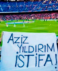 F.Bahçe Başkanı Aziz Yıldırım, aleyhte tezahüratları bitirmek için tribünlere savaş açtı ancak Yıldırım karşıtı taraftarlar tepkilerini Saracoğlu'ndan uzakta da göstermeye devam ediyor. Barcelona'nın Espanyol'u 5-1 yendiği maçı izlemek için Camp Nou'ya giden iki taraftar açtıkları "Aziz Yıldırım istifa" pankartını sosyal medyada paylaşınca büyük ses getirdi.