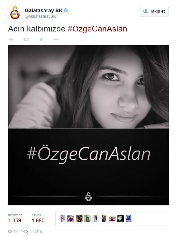 Bu mesajların en anlamlılarından biri de Galatasaray Kulübü'nden geldi. Sarı kırmızılı kulübün resmi Twitter hesabından, "Acın kalbimizde #ÖzgeCanAslan" yazılı tweet atıldı ve altına da bir fotoğrafı kondu.
