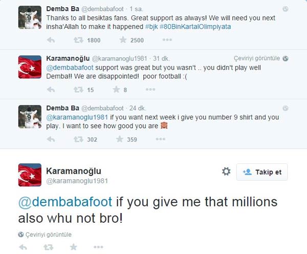 Demba Ba'nın cevabına bir tweet daha atan Beşiktaş taraftarı kullanıcı, yıldız oyuncunun aldığı ücretten bahsetti. Kullanıcının Demba Ba'ya attığı son tweet şu şekilde: