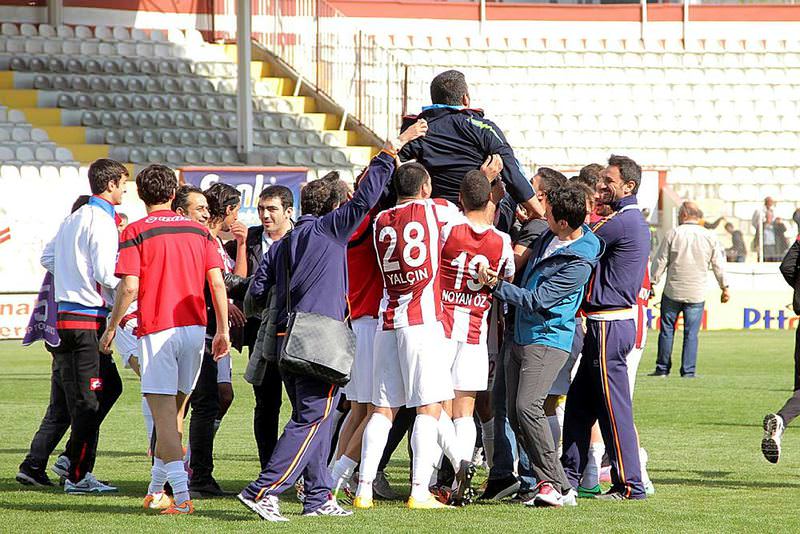 Elazığsporlu oyuncular 2-1 kazandıkları maç sonrası Teknik Direktör Ümit Özat'ı omuzlarında taşıdı.