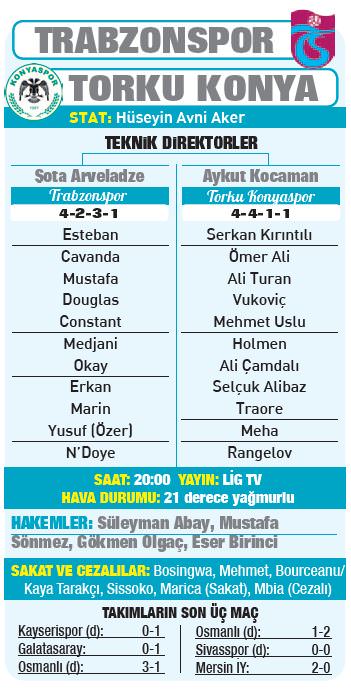 Süper Lige iyi bir başlangıç yapmasına rağmen Galatasaray ve Osmanlıspor'a yenilerek yara alan Trabzonspor, sahasında konuk edeceği Torku Konyaspor'u mağlup ederek moral bulmak istiyor. Sakatlıkları bulunan Mehmet Ekici, Bosingwa ve Bourceanu ile kart cezalısı Mbia bugünkü maçta forma giyemeyecek.