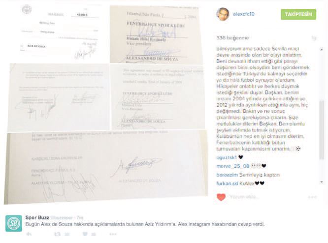 Fenerbahçe'nin sitesinden Alex'e Sevilla ve Beşiktaş maçı primlerinin ödendiğine dair, Alex tarafından imzalandığı öne sürülen dekontların fotoğrafı yayınlandı. Alex ise Instagram hesabından Fenerbahçe ile imzaladığı sözleşmelerin fotoğraflarını paylaşarak imzasının değiştirildiğini ima etti.