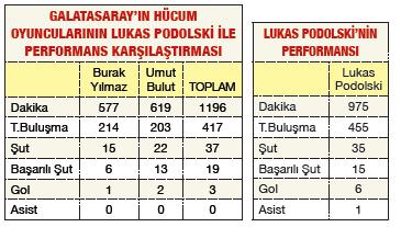 Uzaktan vuruşları ile takımına bu süreçte 5 puan getiren Lukas Podolski etkili şutları ile dikkat çekti. Burak ve Umut toplamda attıkları 19 başarılı şutta ancak 3 gol bulabilirken, Podolski daha az şut ile iki misli gol buldu ve 15 isabetli şutunda 6 gol sayısına ulaştı. Podolski'nin iki isme attığı şut/gol performans farkı 3 kata yaklaştı.