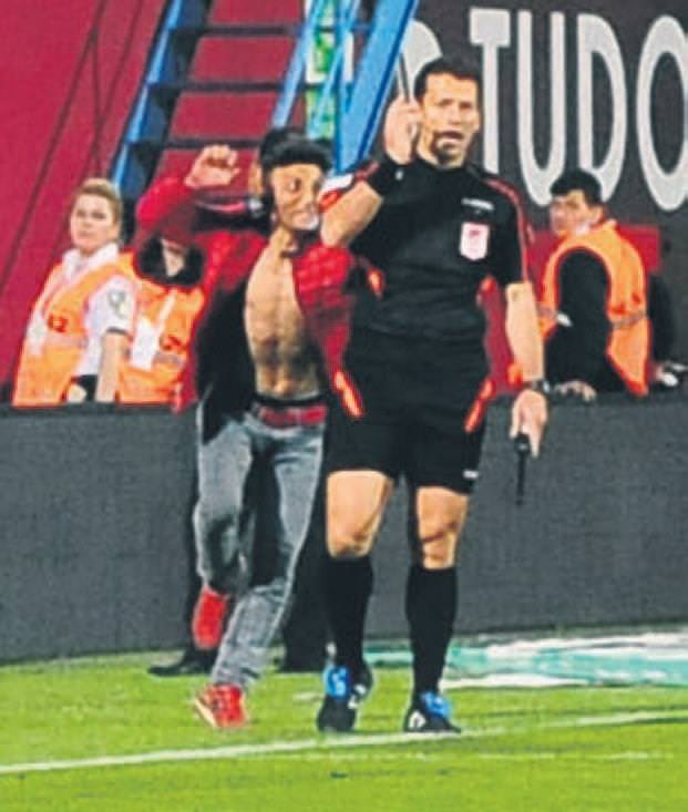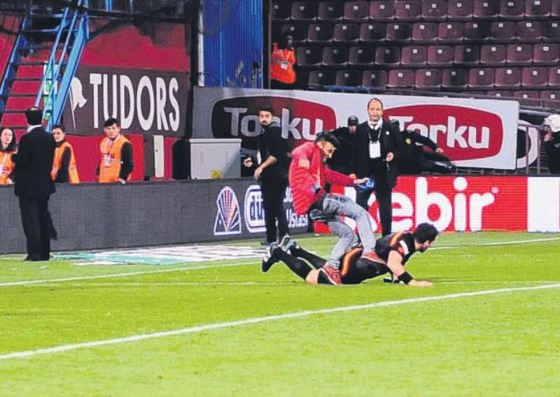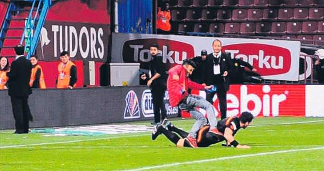 Ardından hakeme bir tekme attı. Bu sırada güvenlik güçleri bu kendini bilmez kişiyi uzaklaştırmaya çalışırken, hakem ve futbolcular soyunma odasına koştu. Trabzonsporlu taraftarlar