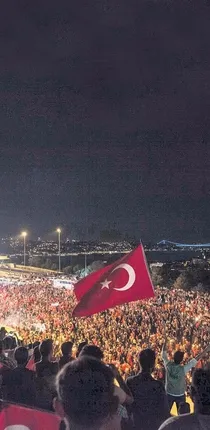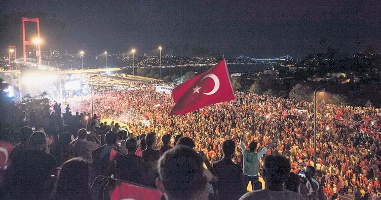 umutla bakmamızı sağladı. Sayın Cumhurbaşkanımız Recep Tayyip Erdoğan'ın da tarihi çağrısıyla, 1000 yıllık köklerimizden gelen vatan sevdası ve aşkıyla Türk milleti bir kez daha büyük bir destan yazıp kahpelere ve Türkiye düşmanlarına '