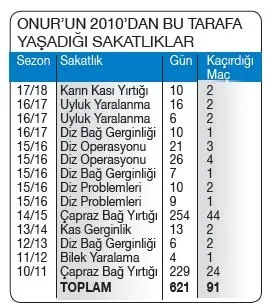 bir fedakarlık örneği gösteren Onur Recep Kıvrak, 2010 yılından bu yana maç kaçırmasına sebep olan 14 önemli sakatlıkla karşı karşıya kaldı. Deneyimli eldiven, bu nedenle
