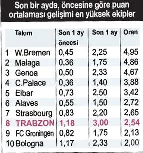 Trabzon gibi son 4 maçını kazanan Fenerbahçe de 1,55'den 3,00'e çıkan puan ortalaması ile gelişim listesinde 12. sırada yer aldı.