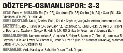 Süper Lig'de 4 maçtır galibiyete hasret olan Göztepe, sahasında ağırladığı düşme hattındaki rakibi Osmanlıspor'a takıldı: 3-3. Maçın hemen başında Özer'in şutu direkten dönerken, İzmir temsilcisi, ilk 35 dakikada Newcastle'dan takım arkadaşları olan Demba Ba ve Gouffran'ın golleriyle öne geçti. Ancak 43. dakikada farkı Özer ile bire indiren Başkent ekibi, 59'da da Cikalleshi ile maça denge getirdi. Göztepe'nin ikinci golünde asist yapan Castro 84. dakikada sahneye çıkıp takımını 3 puana yaklaştırdı. Ancak Osmanlıspor uzatmanın son dakikasında kazanılan penaltıda Cikalleshi'nin golüyle deplasmandan bir puan çıkardı.