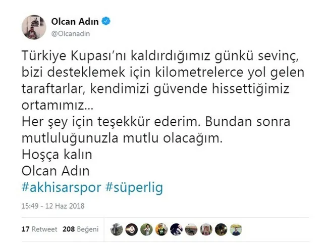 Akhisarspor ile Ziraat Türkiye Kupası şampiyonluğu yaşayan tecrübeli futbolcu yaptığı açıklamada, "Türkiye Kupası'nı kaldırdığımız günkü sevinç, bizi desteklemek için kilometrelerce yol gelen taraftarlar, kendimizi güvende hissettiğimiz ortamımız... Her şey için teşekkür ederim. Bundan sonra mutluluğunuzla mutlu olacağım. Hoşça kalın" ifadelerine yer verdi.