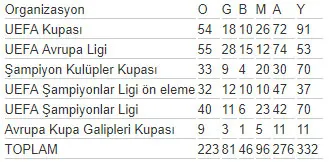 Fenerbahçe'nin Avrupa'da oynadığı 223 maçta aldığı sonuçların tablosu şöyle: