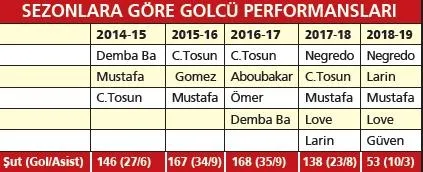 Beşiktaş, Kasımpaşa'nın ardından her ne kadar ligin maç başına en fazla gol atan takımı olsa da forvetlerinin performansı geçtiğimiz yılın gerisinde kaldı. Sezonun yüzde 44'ü geride kalırken, Negredo, Larin, Mustafa, Love ve Güven ligde sadece 10 kez rakip fileleri havalandırırdı. Negredo'nun ayrılışı sonrası ileri uçta kalan 4 isim, performanslarının üzerine koyamadıkları takdirde, son 5 yılında en kötü istatistiklerine imza atacaklar.