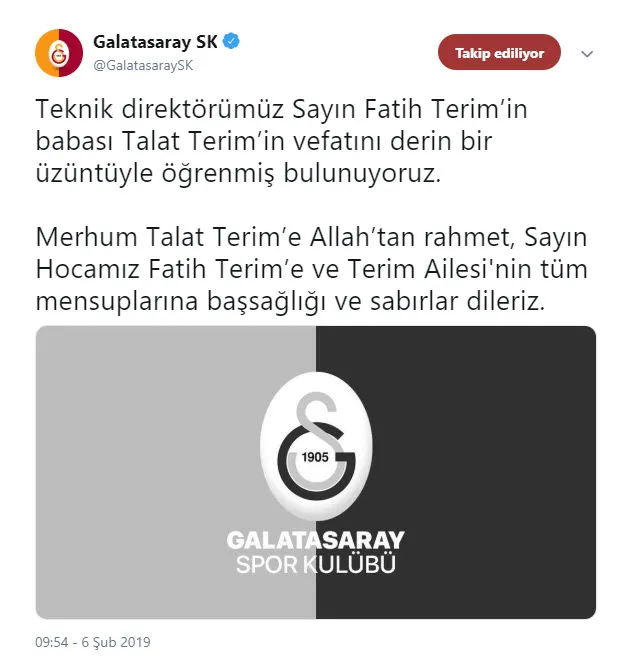 Fenerbahçe de resmi internet sitesi üzerinden Fatih Terim'in vefat eden babası Talat Terim için başsağlığı mesajı yayınladı.