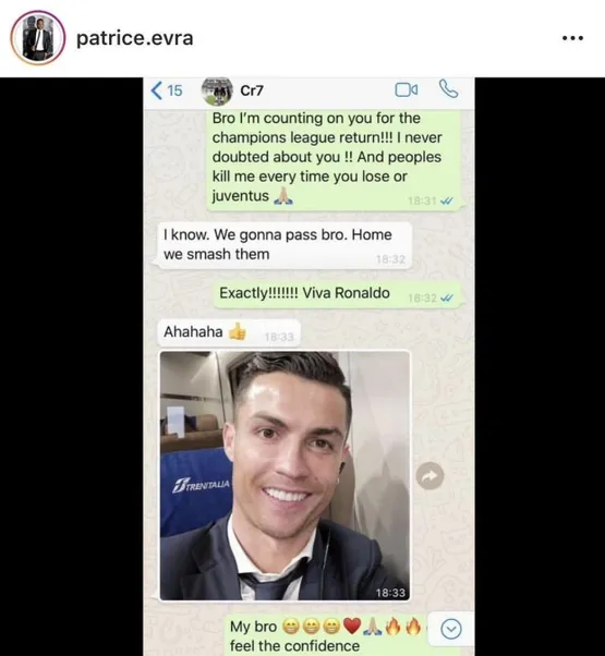 Eski futbolcu Patrice Evra ise maçtan 5 gün önce Cristiano Ronaldo ile WhatsApp'tan yaptıkları konuşmayı paylaştı.