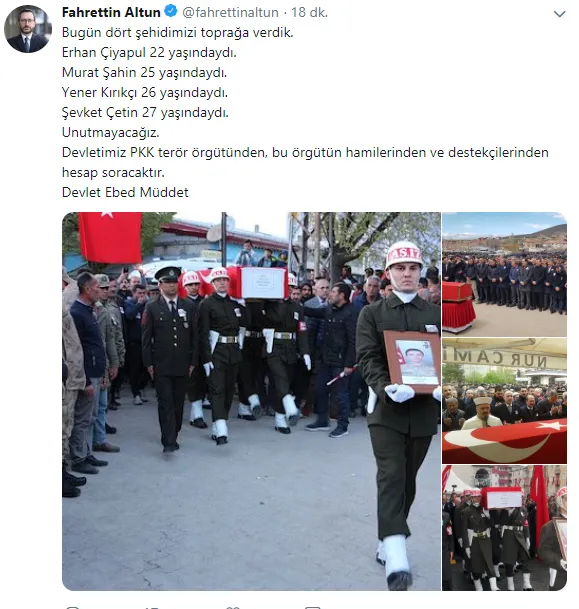 Altun, Twitter hesabından, Türkiye-Irak sınır hattında teröristlerle çıkan çatışmada dört askerin şehit olmasına ilişkin paylaşımda bulundu.
