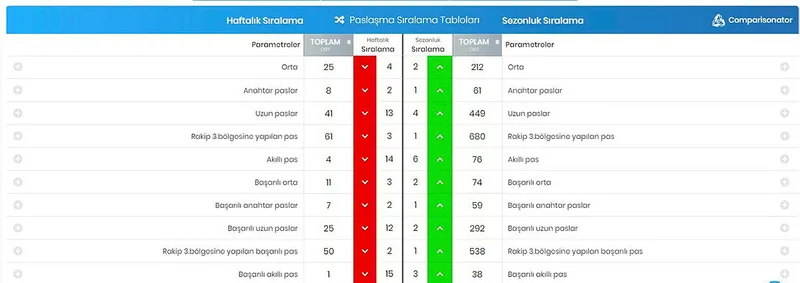 Fenerbahçe'nin Comparisonator'da yer alan pas istatistikleri şöyle: