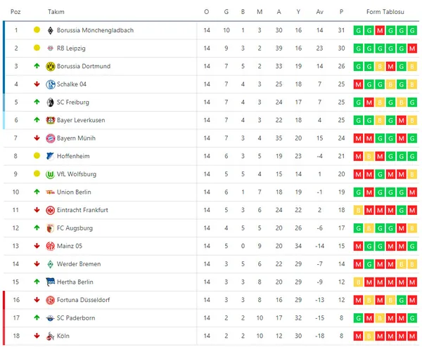 Bundesliga'da önce puan durumuna bakalım. Başakşehir'in yenerek Avrupa dışına ittiği Borussia Mönchengladbach, 31 puanla ligde lider durumda. RB Leipzig, 30 puanla ikinci sırada yer alıyor. İki ezeli rakipten Borussia Dortmund 26 puanla üçüncü, Schalke 04 ise 25 puanla dördüncü sırada. Schalke ile aynı puana sahip takımlardan Freiburg beşinci, Bayer Leverkusen ise altıncı. Son şampiyon Bayern Münih ise lider M'Gladbach'ın 7 pun gerisinde kaldı ve 15. hafta öncesi yedinci sırada yer alıyor.