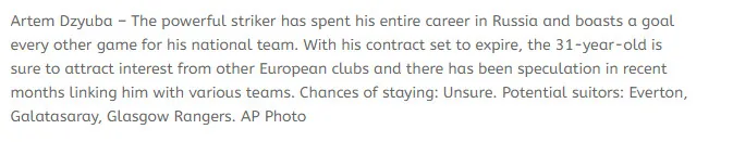 Yabancı basın kaynaklarına göre Galatasaray, Zenit forması giyen Artem Dzyuba için harekete geçti. Daha önce Rusya dışında forma giymeyen yıldız futbolcu için Galatasaray'ın ciddi rakipleri bulunuyor. Dzyuba için, Everton ve Glasgow Rangers da devrede. Sezon sonunda sözleşmesi bitecek yıldız futbolcunun kimi tercih edeceği ise merak konusu.