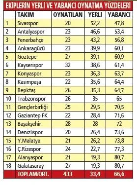 Yerli futbolculara en fazla süre veren ekip olan Sivasspor zirvede yoluna devam ederken en az süre veren ekip ise Galatasaray oldu. Fatih Terim yönetimindeki sarı-kırmızılılarda yerli futbolcular, ilk yarıda toplam sürenin ancak % 19,3'ünde yer alırken yabancı oyuncular ise yüzde 80,7'lik ortalama yakaladı. Öte yandan Süper Lig'de 18 takımın ortalaması incelendiğinde yerliler toplam sürenin yüzde 33,4'ünü, yabancı futbolcular ise yüzde 66,6'sını aldı.