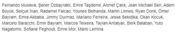 Fernando Muslera, Şener Özbayraklı, Emre Taşdemir, Ahmet Çalık, Jean Michael Seri, Adem Büyük, Selçuk İnan, Radamel Falcao, Younes Belhanda, Martin Linnes, Ryan Donk, Ömer Bayram, Emre Akbaba, Jimmy Durmaz, Mariano Ferreira, Jesse Sekidika, Okan Kocuk, Marcelo Saracchi, Emin Bayram, Marcos Teixeira, Taylan Antalyalı, Berk Balaban, Yuto Nagatomo, Sofiane Feghouli, Emre Mor, Mario Lemina.