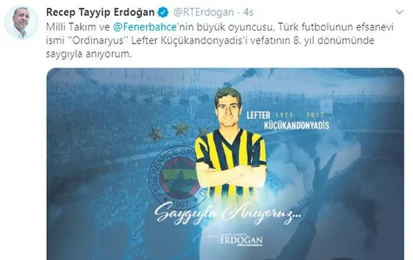 Cumhurbaşkanı Recep Tayyip Erdoğan, F.Bahçe'nin efsanelerinden Lefter Küçükandonyadis'i, vefatının 8. yıl dönümünde saat 19.07'de attığı bu tweetle andı.