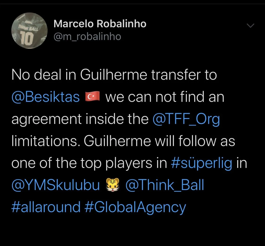 Guilherme'nin ligin ikinci yarısında Beşiktaş forması giymesine kesin gözüyle bakılırken, son dakika gelişmesi gündeme bomba gibi düştü. Brezilyalı futbolcunun menajeri Marcelo Robalinho, TFF harcama limitleri nedeniyle Beşiktaş'ın transferden vazgeçtiğini ve Guilherme'nin Yeni Malatyaspor'da devam edeceğini açıkladı.