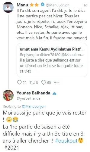 Sarı-kırmızılı bir taraftarın, "Eğer Belhanda'nın takımdan ayrılacağını söylersen seni hayatın boyunca rahat bırakırız" ifadelerine karşı Fransız gazeteci Manu Lonjon, "Belhanda'nın kendisi dedi, menajeri dedi, ben dedim... Ve bir kez daha söylüyorum ocak ayında takımdan ayrılmayacak. İstersen onu Monaco'ya, Nice'e, Schalke'ye, Ajax'a ya da Ittihad'a gönderebilirsin. Seninle her türlü bahse girerim ama sonunda bana ödeme yapmak zorunda kalırsın" cevabını verdi.