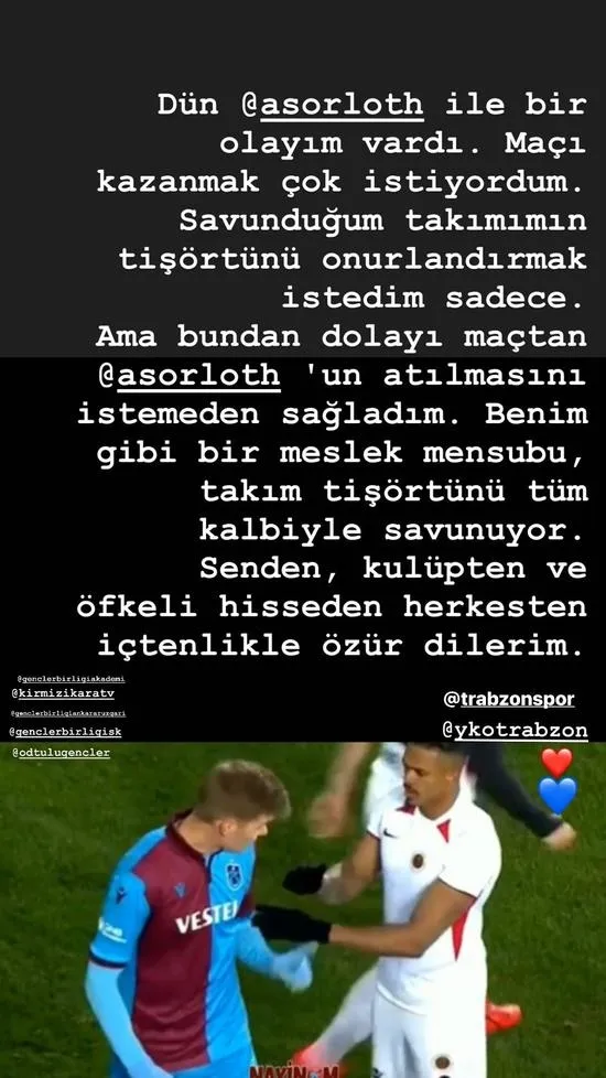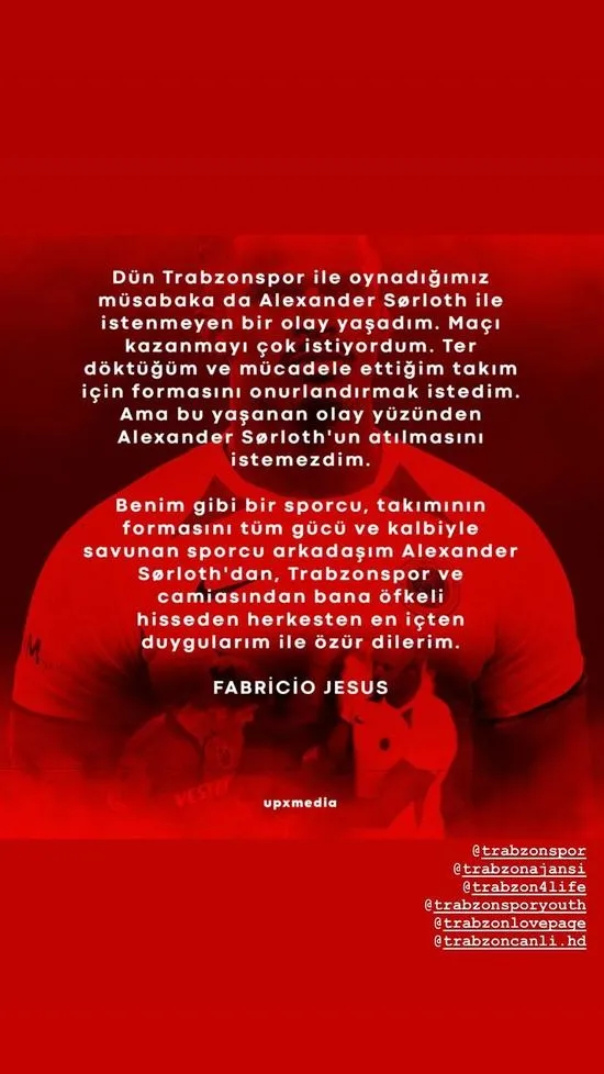 "Dün Trabzonspor ile oynadığımız müsabakada Alexander Sörloth ile istenmeyen bir olay yaşadım. Maçı kazanmayı çok istiyordum. Ter döktüğüm ve mücadele ettiğim takım için formasnı onurlandırmak istedim. Ama bu yaşanan olay yüzünden Alexander Sörloth'un atılmasını istemezdim. Benim gibi bir sporcu, takımının formasını tüm gücü ve kalbiyle savunan sporcu arkadaşım Alexander Sörloth'tan, Trabzonspor ve camiasından bana öfkeli hisseden herkesten en içten duygularım ile özür dilerim."