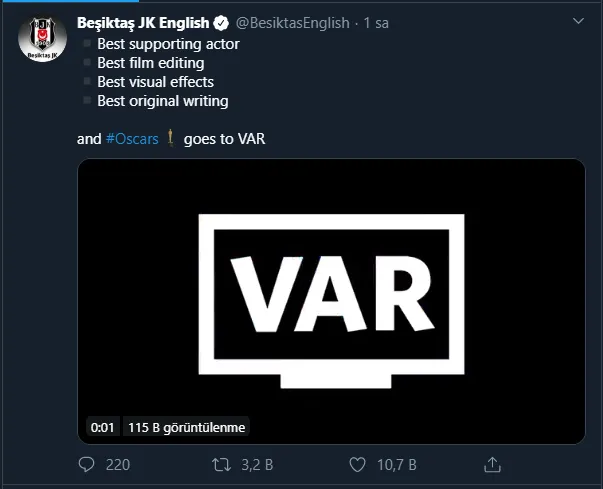 Beşiktaş'tan yapılan paylaşımda "En iyi yardımcı oyuncu, En iyi film kurgusu, En iyi görsel efekt, En iyi özgün senaryo" ifadeleri kullanılarak "Ve Oscar VAR'a gidiyor" ifadesine yer verildi.