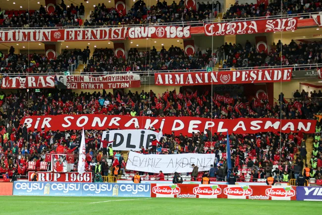 Kırmızı-beyazlı taraftarlar, büyük iki Türk bayrağı ile "Türk çocuğu yurdun için can veren ulu şehitlerini unutma", "Bir sonraki deplasman İdlib" ve "Çelik bile sert değil, gör ki düşman mert değil, ölürüz de dert değil. Üzer hain pusular." yazılı pankartlar açtı.