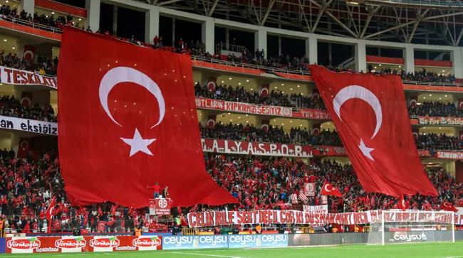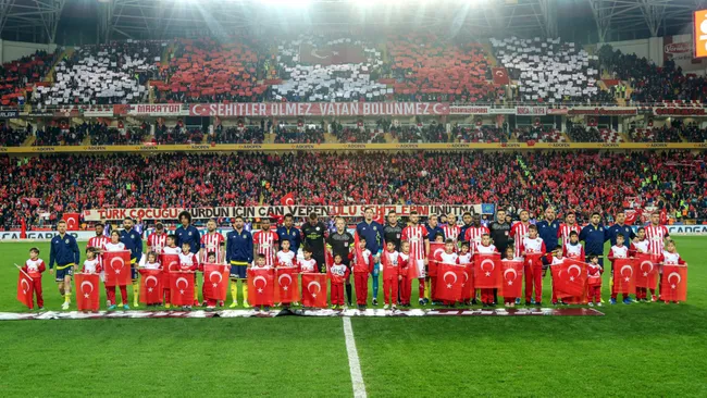 Antalya Stadyumu'nda yer alan seyirciler binlerce Türk bayrağını havalandırırken statta dev Türk bayrakları da açıldı.